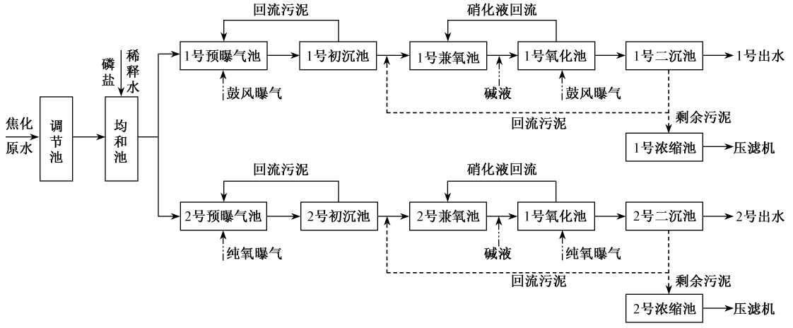 衛(wèi)源曝氣生化系統(tǒng)包括均質(zhì)調(diào)節(jié)池、均質(zhì)池、反硝化池、硝化池,還包括污泥處理系統(tǒng)和輔助系統(tǒng)(其它系統(tǒng)的進(jìn)料泵、儲藥系統(tǒng)、冷卻系統(tǒng)等未列入其它系統(tǒng)的單體設(shè)備)。